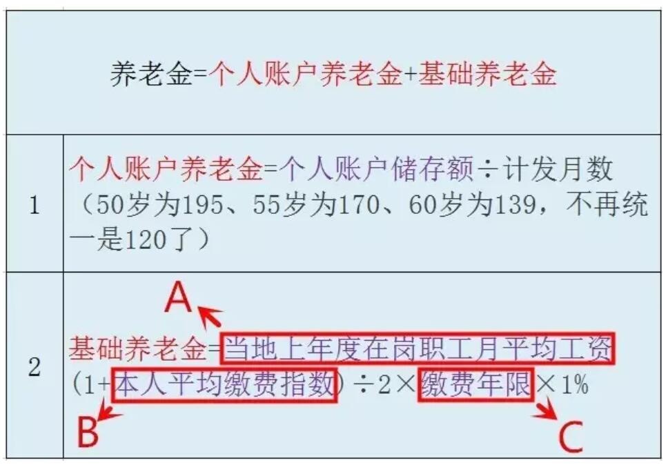 2)个人账户养老金=个人账户的余额÷计发月数(50岁为195、55岁为170、60岁为139)